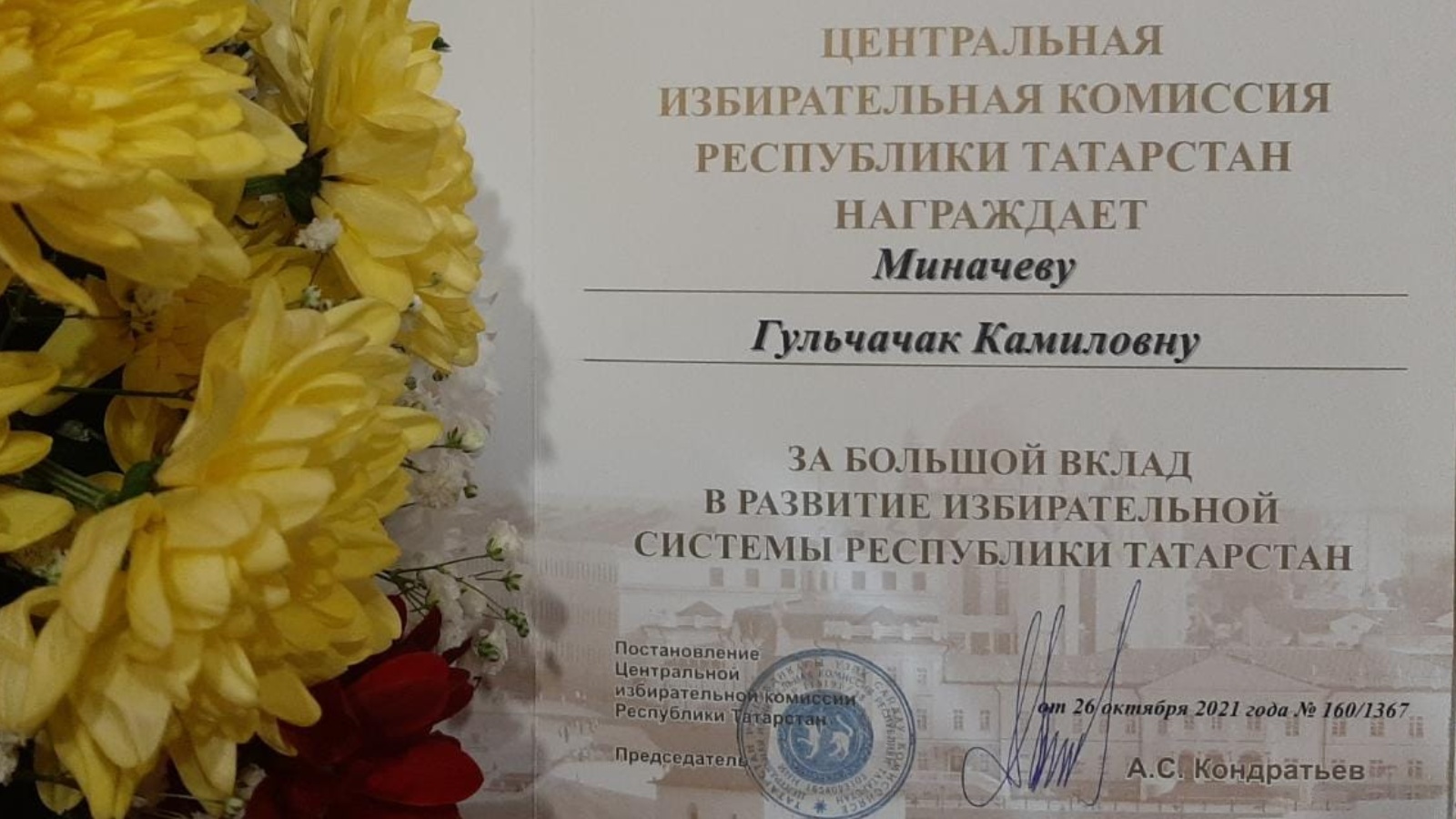 ЦИК РТ награждает Миначеву Г.К. за большой вклад в развитие избирательной системы РТ. ПОЗДРАВЛЯЕМ!