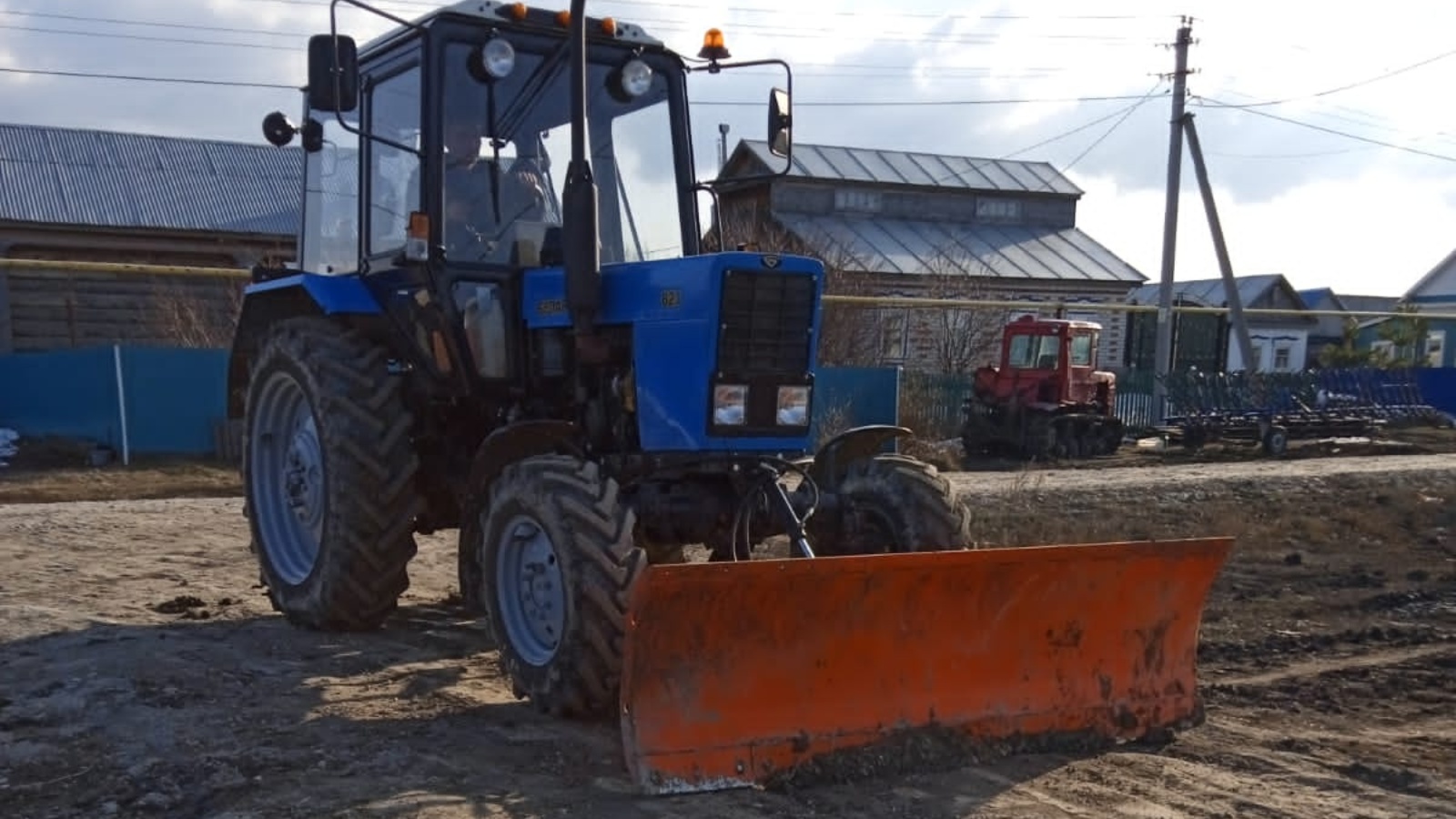 Тракторист Шайдуллов Рафик Ш., на тракторе Исполнительного комитета Беларусь МТЗ-82 выравнивает уличные грунтовые дороги села Малая Цильна.