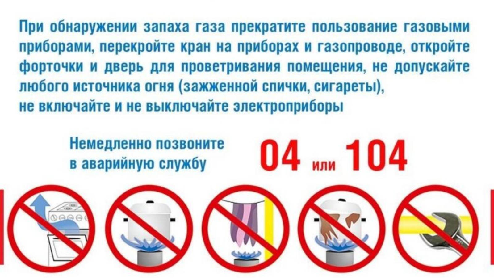 При пользовании газом в быту запрещается: Привязывать веревки к газопроводам (этим нарушается плотность резьбовых соединений, может возникнуть утечка газа и, как следствие, взрыв); сушить белье и волосы над зажженной плитой; самовольно переустанавливать и ремонтировать газовые приборы, баллоны, арматуру; оставлять без присмотра работающие газовые приборы.