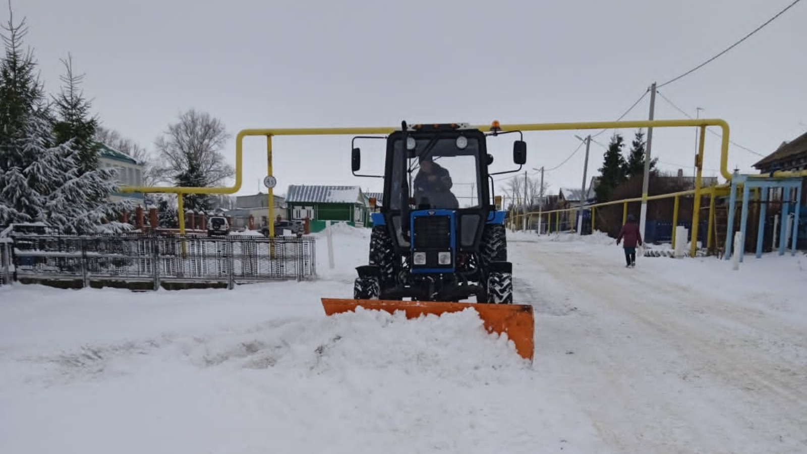 Трактор исполнительного комитета очищает дороги от снега вовремя.