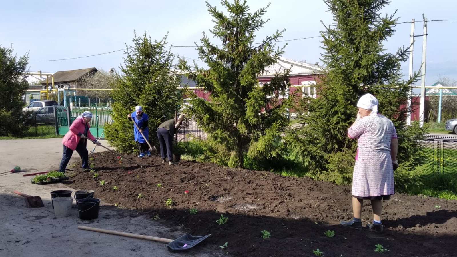 Работники Исполкома около сельского дома культуры посадили цветы.