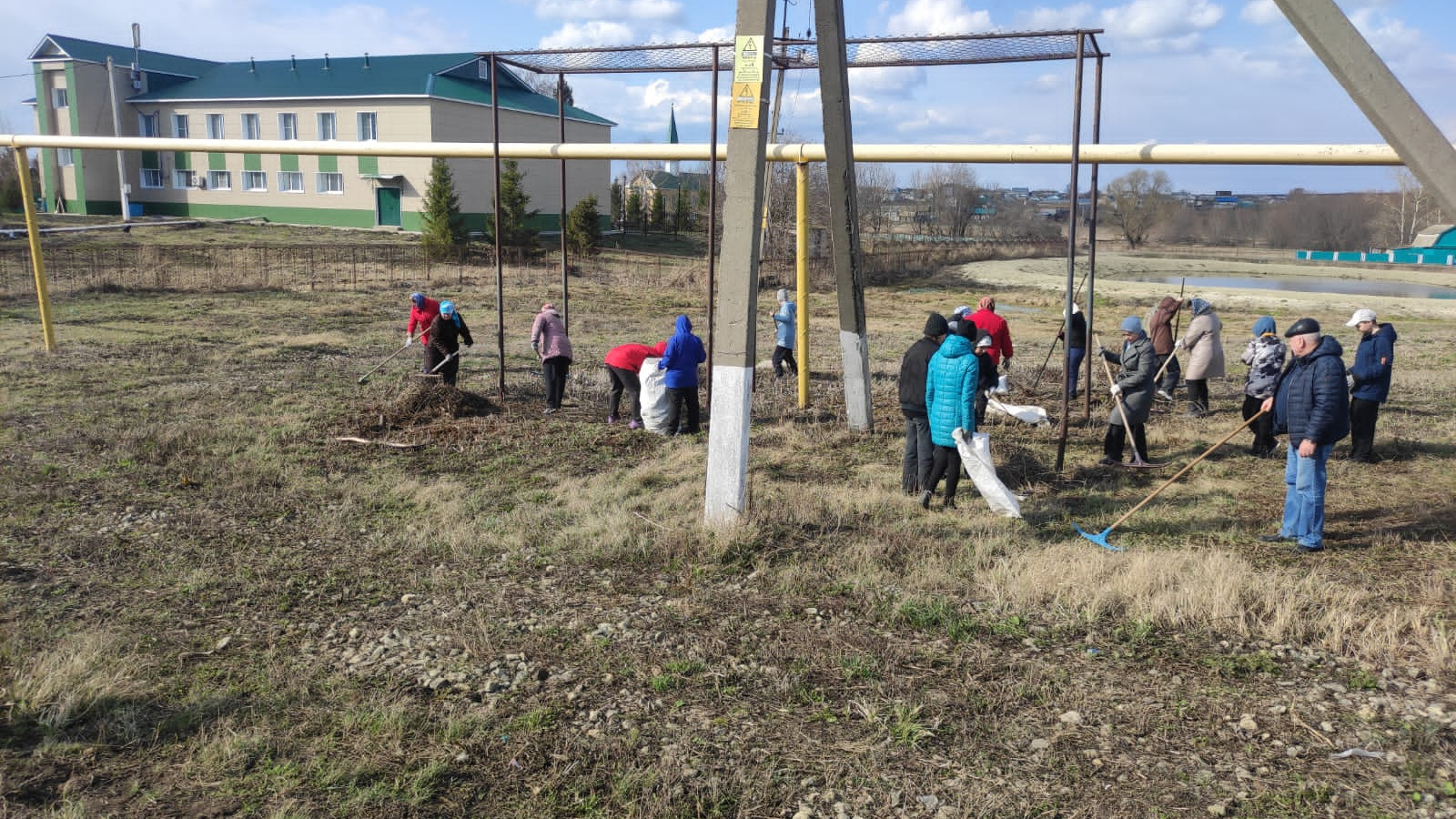 Учителя, школьники вышли на уборку территории школы.